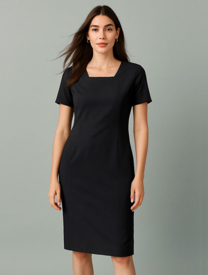 A short sleeve dress that that is designed to a modern cut. The flattering cut also features two full length princess seams at the front to accentuate shape and add interest.